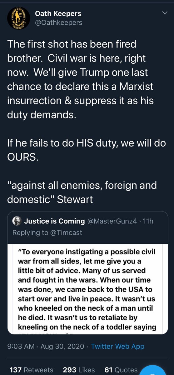 September 2, 20205 yr Oath Keepers are openly declaring Civil War on Twitter. I said it once before... Can we take these guys and Antifa or whoever is on the other side, and shove them off some deserted island somewhere so they can LARP their civil war outside our cities?
