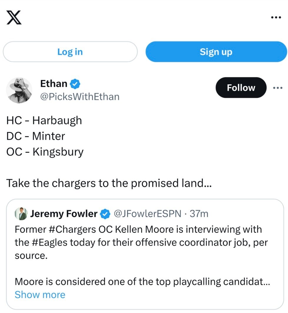January 25, 20241 yr Kellen Moore would be an excellent OC if he came here. Chargers lost too many key players to injuries this past season.