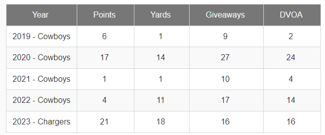 January 28, 20241 yr Author 2 hours ago, Breeze 44 said: Dak was an All-Pro while he was there also...Are you just ignoring ALL the other numbers that his offense had when he was there? I know they don't fit the narrative you're trying to put out there but this was a strong hire. Not sure why people are down on the hire. The offense rankings during his 5 years as OC: Twice led the league in yards gained and top 10 in points scored 3 times. The down year in Dallas (2020) was when they lost Dak and were playing Dalton and DiNucci and obviously numerous injuries in LA this past year.