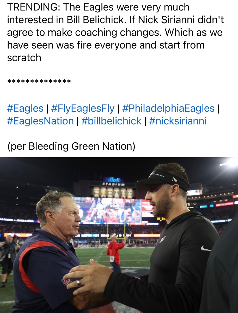 January 31, 20241 yr Author 8 hours ago, pgcd3 said: I think fodder. Eskin said Lurie wasn't into Bellichik and like him or not he's pretty plugged in there. Also I don't think Bellichik is a backup plan. He's kind of a mindset unto himself and if you're going that direction then I don't think you base it off of Nick's willingness to get new coordinators. Just my two cents Bill Belichick was and is on Eagles’ radar, too By Mike Florio Published January 31, 2024 06:34 AM Publicly, Cowboys owner Jerry Jones hasn’t ruled out hiring free-agent coach Bill Belichick in the future. Privately, the Eagles reportedly haven’t ruled it out either. Appearing on 98.5 The Sports Hub, Greg Bedard of Boston Sports Journal said that the Eagles could have hired Belichick if things had gone south with Nick Sirianni after the 2023 season — and if they fall apart again in 2024. "Probably the most interesting thing that I’ve heard, and again this is just Senior Bowl rumor mill, is that the Eagles were very interested in Belichick if things didn’t work out with Nick Sirianni and they could be at the front of the line if things again go poorly for him next year,” Bedard said, via Erin Walsh of Bleacher Report. That’s not a full-blown, official report. Bedard clearly attributes it to the "rumor mill” at the Senior Bowl. It’s precisely the kind of thing that gets said extemporaneously during a radio appearance and never gets reduced to writing with a byline. Still, he said it. And it meshes with the chatter that ricocheted on the grapevine in the days after the Eagles completed a 1-6 collapse by losing to the Buccaneers in the playoffs, 32-9. Bedard explained that things went sideways for Doug Pederson and the Eagles during the postseason meeting between coach and owner Jeffrey Lurie. (They had an impasse over coordinators.) That could have happened for Sirianni, too. Based on the mask of various negative emotions that Lurie donned in the fourth quarter of the playoff loss, Sirianni likely needed to say something to get Lurie to believe that Sirianni knows what went wrong and has a good idea for fixing it (other than, you know, having "confidence” that it will be fixed). "I told you guys that before the end of the season that teams had already reached out to Bill, backchanneled on Bill, I thought the Falcons were definitely one of them,” Bedard said. "I’m now pretty convinced that the Eagles were the other one. When things were going south, they thought this might end poorly with Sirianni and I wouldn’t be surprised given the relationship that [G.M.] Howie [Roseman[ and Bill have that the Eagles were one of those teams to backchannel through Bill.” In other words, add the Eagles to the list of teams that could be pursuing Belichick for 2025, along with the Cowboys. And, possibly, the team in New York with which Belichick won a pair of Super Bowls as defensive coordinator. Unless, of course, someone else hires him in the current cycle. Given that three teams in the NFC East have been credibly linked to Belichick, the one currently looking for a coach might want to consider whether to join him before they find out they can’t beat him as a twice-per-year rival within the same division. https://www.nbcsports.com/nfl/profootballtalk/rumor-mill/news/bill-belichick-was-and-is-on-eagles-radar-too
