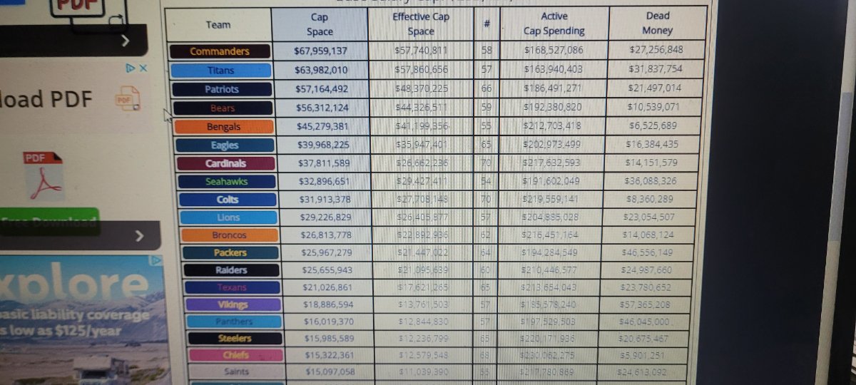 March 14, 20241 yr 12 minutes ago, joemas6 said: Look at the cap space for 32 teams... only 5 teams have more cap space than the Eagles. Nope Howie a moron can’t manage the cap we can’t sign a LB or keep guys like Sweat and Reddick because of it.