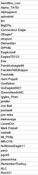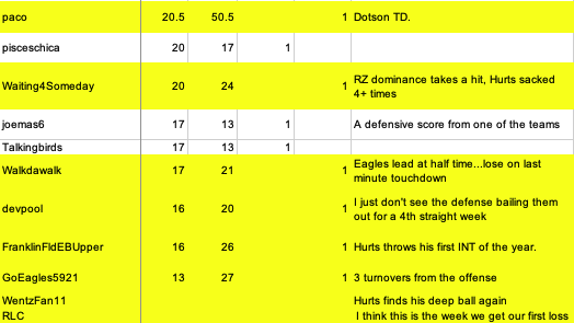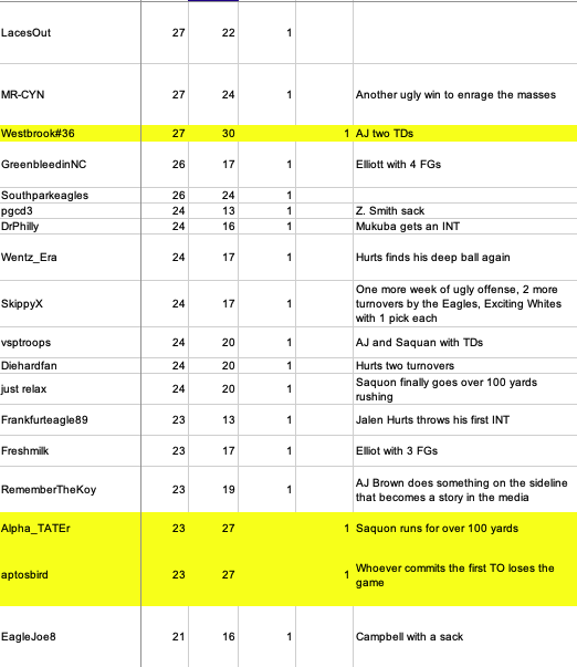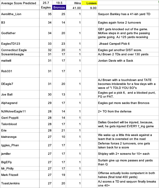 16 hours ago16 hr Sunday Morning Eagles-Broncos Game Score Predictions Update - 11 hours until Kickoff50 predictions recorded41 predictions are for an Eagles win and 9 are for a Broncos win. The average predicted score is Eagles 26 Broncos 19.I believe I got everyone's prediction. If you don't see your name below, I either missed your prediction or you haven't submitted one yet.As always, please tag your prediction post with @mattwill that way I will be sure to see/record it. Score predictions can also have an optional "Bonus Pick" tiebreaker prediction. I will be taking predictions right up until Kickoff.A list of the 50 predictions is presented below, sorted high to low by Eagles points predicted. The Broncos win predictions are highlighted in yellow.The alphabetical list of the screen names of the 50 posters who have submitted this week is as follows. If you don't see your name there, I don't have a prediction recorded for you yet.