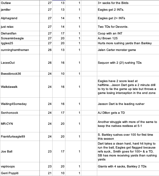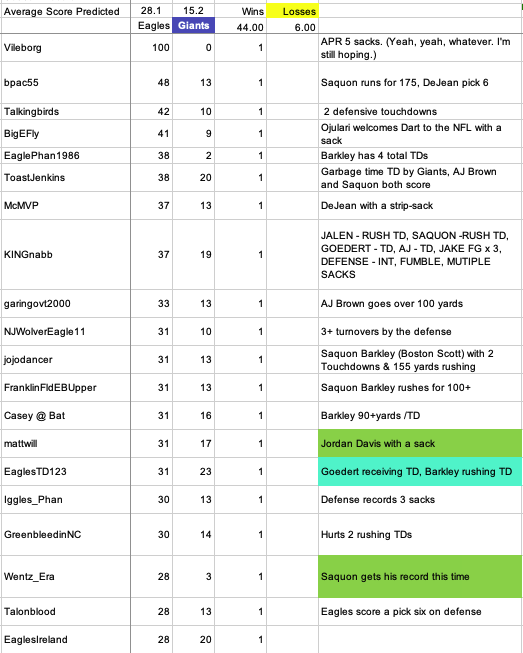 Yesterday at 12:18 PM1 day Final Giants Game Score Prediction ResultsA total of 50 predictions were recorded with 6 for a Giants win and 44 for an Eagles win.The six were @B3 (20-21) @kiwieagle (20-23) @GoEagles614 (16-17) @Giggity_goo (14-26) @GoEagles5921 (13-23) and @Westbrook#36 (13-24)@Giggity_goo's Eagles 14 Giants 26 gets the chicken dinner.7 Bonus predictions were correct or close to correct@mattwill with "Jordan Davis with a sack"@EaglesTD123 with "Goedert receiving TD, Barkley rushing TD" (half correct)@Wentz_Era with "Saquon gets his record this time" (He made it to 7541 rushing yards)@aptosbird with "More sloppiness and asinine play calling"@GoEagles614 with "No individual receiver goes over 75 yards receiving on our team, and Jordan Davis gets a sack" (half correct)@Giggity_goo with "Love our Eagles but the wheels fell off"@GoEagles5921 with "Skattebo over 100 yards rushing " (He got 98, but I'm not going to split hairs)The question before us now is whether the 6 Days from Hell will become 16 Days from Hell. I wish I knew the answer.The final list of the 50 predictions is as follows: