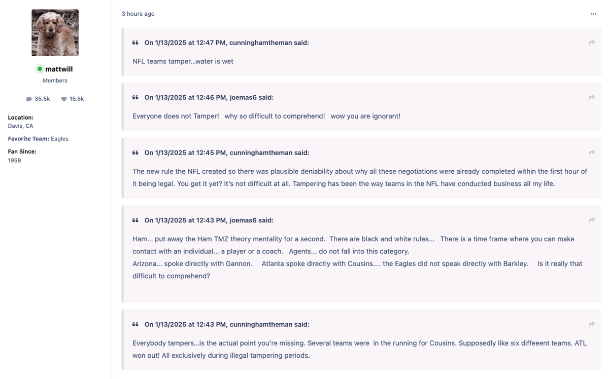 15 hours ago15 hr 7 hours ago, mattwill said: On 1/13/2025 at 3:47 PM, cunninghamtheman said: NFL teams tamper…water is wet On 1/13/2025 at 3:46 PM, joemas6 said: Everyone does not Tamper! why so difficult to comprehend! wow you are ignorant! On 1/13/2025 at 3:45 PM, cunninghamtheman said: The new rule the NFL created so there was plausible deniability about why all these negotiations were already completed within the first hour of it being legal. You get it yet? It’s not difficult at all. Tampering has been the way teams in the NFL have conducted business all my life. On 1/13/2025 at 3:43 PM, joemas6 said: Ham... put away the Ham TMZ theory mentality for a second. There are black and white rules... There is a time frame where you can make contact with an individual... a player or a coach. Agents... do not fall into this category. On 1/13/2025 at 3:43 PM, cunninghamtheman said: Everybody tampers…is the actual point you’re missing. Several teams were in the running for Cousins. Supposedly like six diffeeent teams. ATL won out! All exclusively during illegal tampering periods.You see the struggle when trying to explain something to him!!!!