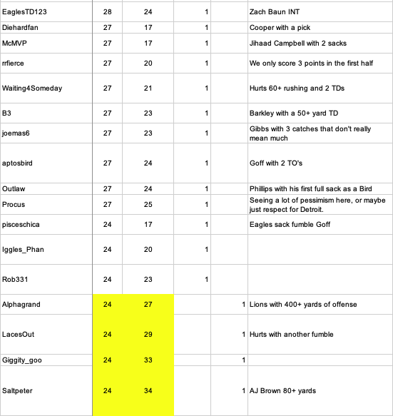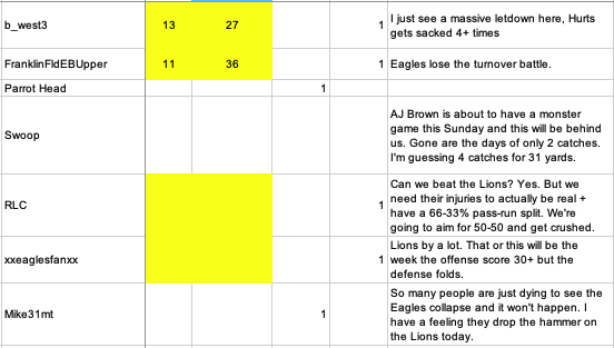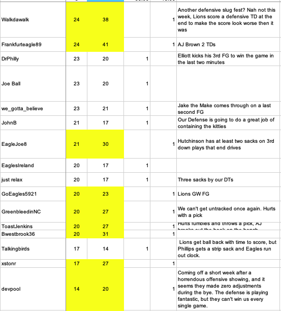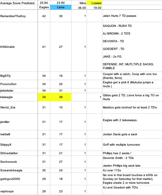 4 hours ago4 hr Pregame Warmup Eagles-Lions Score Predictions Update - less than an hour until Sunday Night Kickoff54 predictions recorded. 36 are for an Eagles win and 18 are for a Lions win ... a 2 to 1 ratio. The average predicted score now favors the Eagles ... Eagles 26 Lions 24.NOTE: The Bonus predictions this week have been a lot of fun. Some of them are very creative.I believe I got everyone's prediction. If you don't see your name below, I either missed your prediction or you haven't submitted one yet.As always, please tag your prediction post with @mattwill that way I will be sure to see/record it. Score predictions can also have an optional "Bonus Pick" tiebreaker prediction. I will be taking predictions right up until Kickoff.The list of the 54 predictions that are recorded thus far is presented below, sorted high to low by Eagles points predicted.