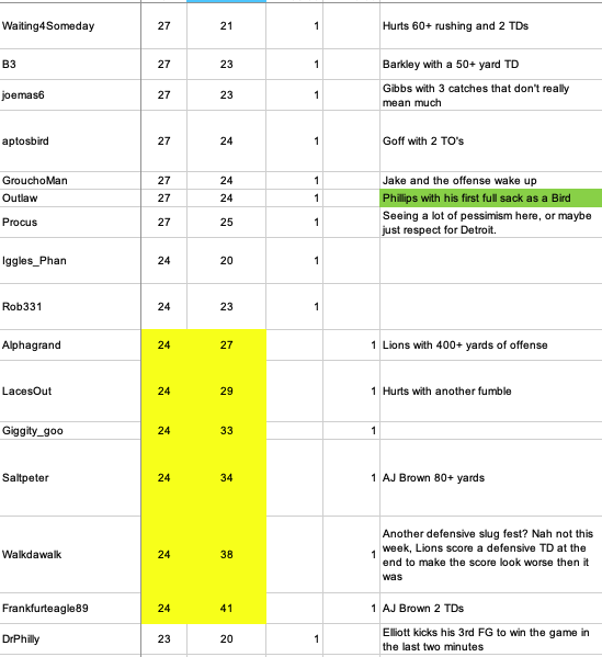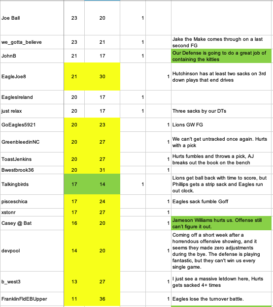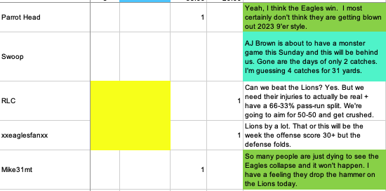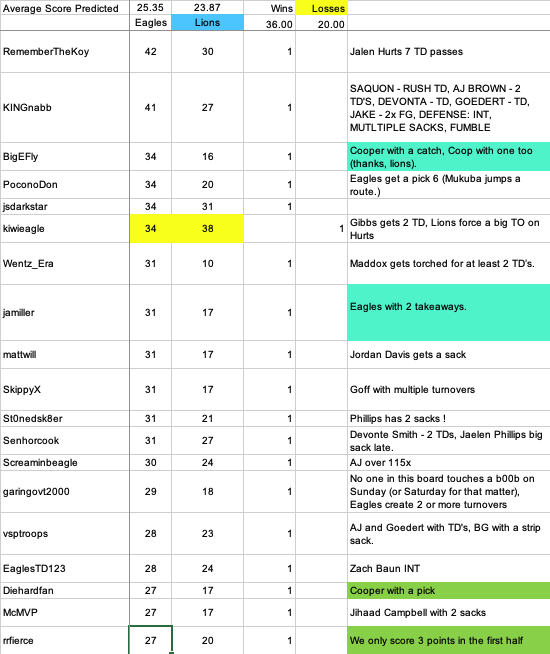1 hour ago1 hr Final Lions Game Score Prediction ResultsFirst, there is a correction to last week's Results. @joemas6 was not listed with his correct Bonus prediction of "One of the new guys on defense gets a sack or turnover." Jaelan Phillips did have a recovered fumble.Now, on to this week's results. A total of 56 predictions were recorded with 20 for a Lions win and 36 for an Eagles win.@Talkingbirds prediction of an Eagles 17-14 win was the closest, and wins the chicken dinner. @Casey @ Bat hit on the Eagles' 16 points, but had the Lions with 20.It was a very creative week for Bonus picks. They definitely were entertaining to read. Here are the ones that were correct or close to correct@BigEFly got his half right with "Cooper with a catch, Coop with one too (thanks, lions)" If he had said "Cooper with a hitch" he'd have gotten both.@jamiller's "Eagles with 2 takeaways" gets the Sirianni stamp of approval. Nick sees the 4th down denials as turnovers.@Diehardfan had "Cooper with a pick"@rrfierce had "We only score 3 points in the first half"@Outlaw with "Phillips with his first full sack as a Bird"@JohnB with "Our Defense is going to do a great job of containing the kitties"@Casey @ Bat with "Jameson Williams hurts us. Offense still can’t figure it out." Although arguably the wind had a lot of negative impact on both Offenses.@Parrot Head with "Yeah, I think the Eagles win. I most certainly don't think they are getting blown out 2023 9'er style."@Swoop was mostly right with his "AJ Brown is about to have a monster game this Sunday and this will be behind us. Gone are the days of only 2 catches. I'm guessing 4 catches for 31 yards."and@Mike31mt with "So many people are just dying to see the Eagles collapse and it won't happen. I have a feeling they drop the hammer on the Lions today."In the first eleven weeks the closest predictors have been@Freshmilk and @Bwestbrook36 in Week One's 72 predictions@just relax in Week Two's 55 predictions@Diehardfan in Week Three's 56 predictions@Screaminbeagle in Week Four's 61 predictions@Walkdawalk in Week Five's 59 predictions@Giggity_goo in Week Six's 50 predictions@kiwieagle and @Diehardfan in Week Seven's 52 predictions@McMVP in Week Eight's 50 predictions@b_west3 in Week Ten's 54 predictions@Talkingbirds in Week Eleven's 56 predictionsHere is the final list of the predictions and bonuses: