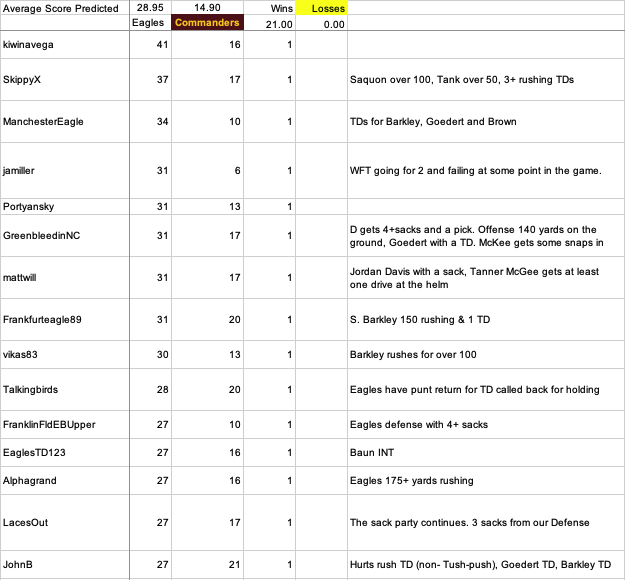 December 20, 2025Dec 20 Saturday (Game Day) Morning Eagles-Commanders Game Score Predictions -- 14 hours until KickoffOnly 21 predictions have been recorded so far with all 21 for an Eagles win ... with an average predicted score of Eagles 29 and Commanders 15As we do each week, we are gathering Game Score predictions. As always, please tag your prediction post with @mattwill that way I will be sure to see/record it. Score predictions can also have an optional "Bonus Pick" tiebreaker prediction. I will be taking predictions right up until Kickoff. If someone posts a prediction without a tag, please reply to it including the @mattwill tag.Those 21 predictions are: