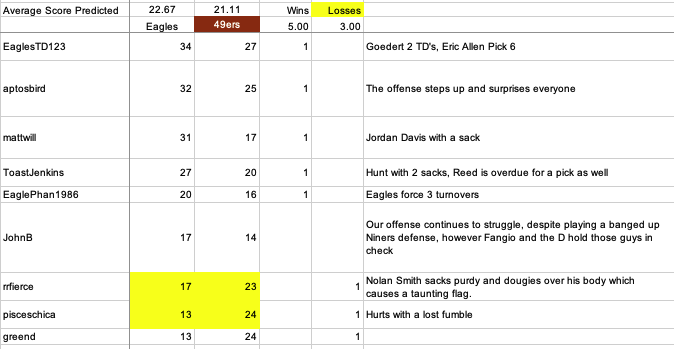 10 hours ago10 hr Wednesday afternoon Eagles-49ers Game Score Predictions -- 99 hours until Kickoff8 predictions recorded thus far. 5 are for an Eagles win and 3 for a Niners win. The average predicted score is Eagles 23 49ers 21.As we do each week, we are gathering Game Score predictions. As always, please tag your prediction post with @mattwill that way I will be sure to see/record it.ย Score predictions can also have an optional "Bonus Pick" tiebreaker prediction.ย I will be taking predictions right up until Kickoff. If someone posts a prediction without a tag, please reply to it including the @mattwill tag.The 8 recorded predictions are: