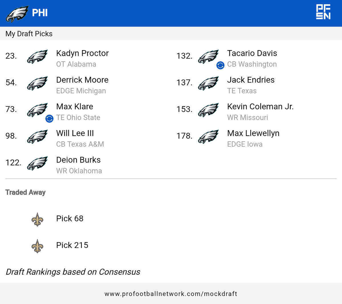March 10Mar 10 I like this mock 2 tall CBs 2 TEs 2 Edge rushers 2 WRs slot and a returner. Davis and Coleman Jr are two of my favorite late rd picks. I love Davis's measurables 6'4 195 4.41 40 he has inconsistent tape which is why he's a later pick but if he develops he could be a stud. Coleman Jr is a returner and can play on special teams could be a nice add.