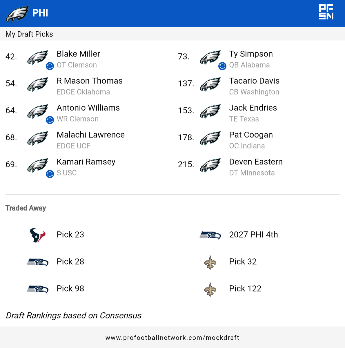 23-Proctor/Lomu-OT.......... 54-Stowers-TE........68-Lawrence/Sutton-edge ................98-Bryce Lance-WR.......................122-Jalen Farmer-RG................137-VJ Payne-S........................153- Singleton-RB..............178-Capehart-DL.................215-Payton-QB