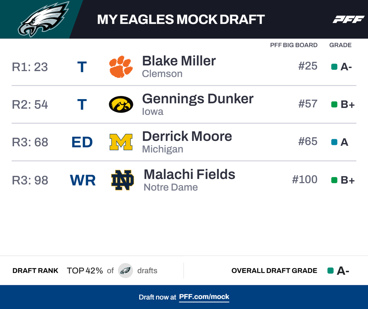 Thursday at 03:10 PM5 days Author OT-done, RG-done, edge-done and a nice WR(who was the first guy I picked out of the crowd ) BTW Miller was 2nd at the combine with 32 bench reps. Him and Dunker(hay bale toss champ) would be a very strong combo for us on the O line going forward. However doing this means TE would come from a later group. I DO however like this 3 round mock