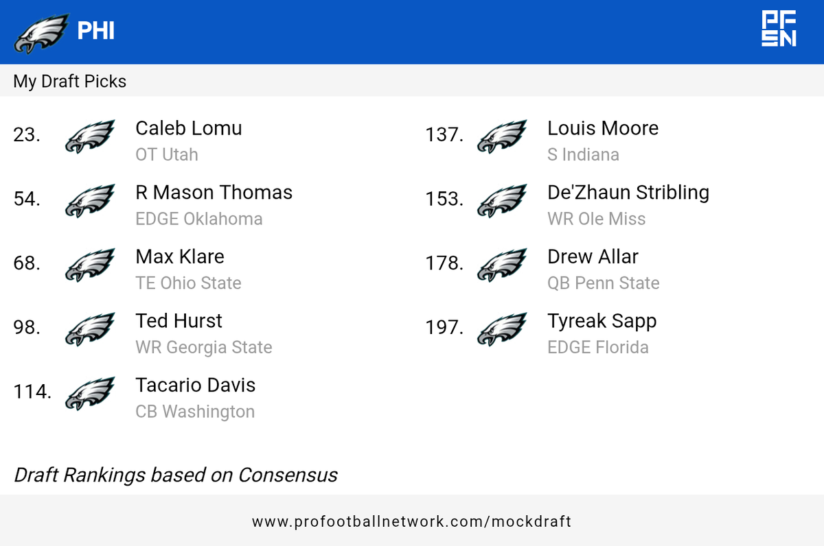 Saturday at 07:13 PM3 days 6 hours ago, Asg 15 said:No O linemen until their last pick?Never gonna happenIt's not really that accurate of a draft, did you see the top 2 picks? If it played out that way I would be ecstatic, but both are not going to be there that late. Here is a more realistic draft, except for pick 197 which will be gone long before then probably.