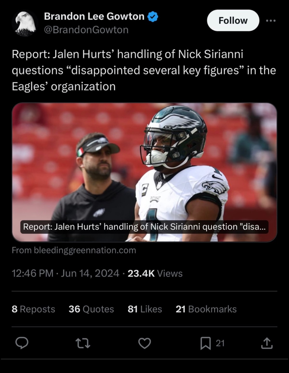 June 14, 20241 yr 19 hours ago, cunninghamtheman said: always loved screaming HUGGGGHHHHH every time he made a sack back in the day. But I couldn’t disagree with his opinion anymore. Don’t get how Siri kept his job as it was. Frankly doesn’t seem like he has much of a job he kept after all anyway. What does Hurts need to get in lockstep with Siri to do? Media just is very knowledgable about the whole situation here with this team. Everybody knows Siri basically isn’t running sh17! So the media guy tried to corner Hurts on it. There is no great answer. Just another person trying to blame Hurtsfor freaking everything. Don’t have to like Hughes take but he is not exactly wrong either this could be getting blown out of proportion but it’s still there and if we struggle all this will keep rearing it head again and again