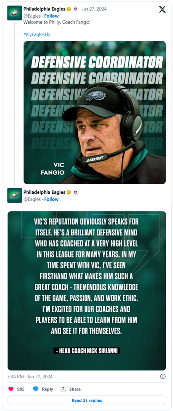 Posted January 28, 20241 yr Eagles hire Vic Fangio as new defensive coordinator: How the change could affect Philadelphia in 2024 An early forecast of the Eagles' new defense By Cody Benjamin Jan 27, 2024 at 4:02 pm ET A year after first eyeing him for the position, the Eagles have finally secured their man, bringing Vic Fangio back to Philadelphia as Nick Sirianni's new defensive coordinator. The team made it official Saturday. The former Broncos head coach marks the Eagles' first major addition since a late-season collapse, signed to revitalize what became one of the NFL's worst defenses in 2023. Fangio, 65, is no stranger to Philly. He was born and raised in Dunsmore, Pennsylvania, about two hours from the city. He also worked alongside Sirianni in 2022, when he quietly served as a consultant to Jonathan Gannon's NFC-champion defense. In many ways, then, this pairing was always inevitable; even after becoming the Dolphins' DC last offseason, Fangio hinted he would've had the same job with the Eagles if not for Gannon's delayed departure to become the Cardinals' head coach. But what, exactly, does Fangio's arrival mean for the Eagles defense? How might his entrance affect the way the team plays, and/or which kinds of players it prioritizes in offseason roster-building? Just as Fangio's now been tied to the organization for years, his influence on the Eagles' strategy has been apparent for a while. The former Broncos coach is best known for maximizing and/or popularizing a two-high-safety scheme, which essentially prioritizes prevention of the big play: Always have back-end help in place, and keep everything in front of you. It's precisely the kind of defense the Eagles ran under Gannon in 2022, and again, to a different degree, under Sean Desai and Matt Patricia in 2023. So why would they double-down on an approach that gradually got worse from 2022-2023, leaving them with one of the most porous units in all of football? To start, it's one thing to imitate a Fangio defense, and another to employ Fangio himself. This is a man who's overseen 10 different top-10 defensive finishes at five different stops as a DC or head coach, including with Miami this year. His personnel has varied. His staffs have varied. But his results as head of a defense have been remarkably consistent. Fangio, remember, spent much of 2022 advising the Eagles, so he's familiar with some of the best talent already on their defensive roster, chiefly pass rushers Haason Reddick and Josh Sweat, who helped the club log a franchise-record 70 sacks that year. This season, while Desai showcased some more creative looks before his polarizing reassignment in December, the Eagles effectively still banked on their front four to do the heavy lifting, and when Reddick and Sweat couldn't replicate their 2022 dominance, everything fell apart. It didn't help that the aging secondary was beset by injuries, enabling opponents to get the ball off quicker. Now, with Fangio in full control, the Eagles figure to transition to a more blatant 3-4 scheme. Under both Gannon and Desai, the team technically deployed a 4-3 base but with ever-changing pass-rush groupings, often letting Reddick work as a stand-up rusher, the same way he might in a 3-4 design. Veteran defensive linemen like Brandon Graham and Fletcher Cox have rotated both inside and outside for years, but if they return under Fangio, they're virtual locks to see more time as 3-4 ends, with someone like Jordan Davis (6-6, 335) bumped into the middle as a gap-plugging nose tackle. Fans shouldn't expect the blitz rate to change much. Enticing as a pressure-heavy approach might be, it's just not Fangio's calling card. Again, the motto with his defense has traditionally been to contain and control. Make the offense work harder and longer to put points on the board. The X factor here is talent. Making the offense play dink-and-dunk can be a brilliant strategy if you have the personnel to simply win matchups over the long haul, but if, say, you've got a gaping hole at linebacker and you're up against smart pocket passers, you're liable to give opponents full control of the ball and clock, as Gannon's "D" infamously did against Patrick Mahomes and the Chiefs in Super Bowl LVII. There is no one position that matters exceedingly more than another in a Fangio defense; this is still a team game, and a defense that contains rather than aggressively strives for big plays requires steady production from front to back. But if we presume that Reddick and Sweat return as the Eagles' top edge rushers, and project 2023 rookie Jalen Carter as a potential difference-maker at 3-4 end, the clear priorities for general manager Howie Roseman this offseason would seem to be linebacker and safety. Cornerback is another major area of focus, with both Darius Slay and James Bradberry seemingly regressing in both speed and durability, but Fangio's two-high-safety looks tend to work best when that last line of defense is buoyed by well-rounded starters -- guys who can fly around and do all the little things well, be it step up in run defense or close quickly in zone coverage. Think Justin Simmons and Kareem Jackson in 2021, when Fangio's Broncos "D" ranked No. 3 in points allowed. At LB, meanwhile, you can make the case that Fangio's expertise is enough to boost the stock of even midgrade veterans. On the surface, that jibes with the Eagles' general philosophy under Roseman, which is to allocate top dollar to front-four and perimeter players -- defensive tackle, edge rusher, cornerback, etc. -- and take bargain-bin swings in the middle. But when considering that some of Fangio's best years have coincided with all-star runs by elite LBs like Roquan Smith, NaVorro Bowman and Patrick Willis, it's not a stretch to suggest Roseman and Co. will likely be more invested in that spot this spring. Because, again, at the end of the day, in a Fangio defense, the point of sitting back rather than sending extra pressure is to 