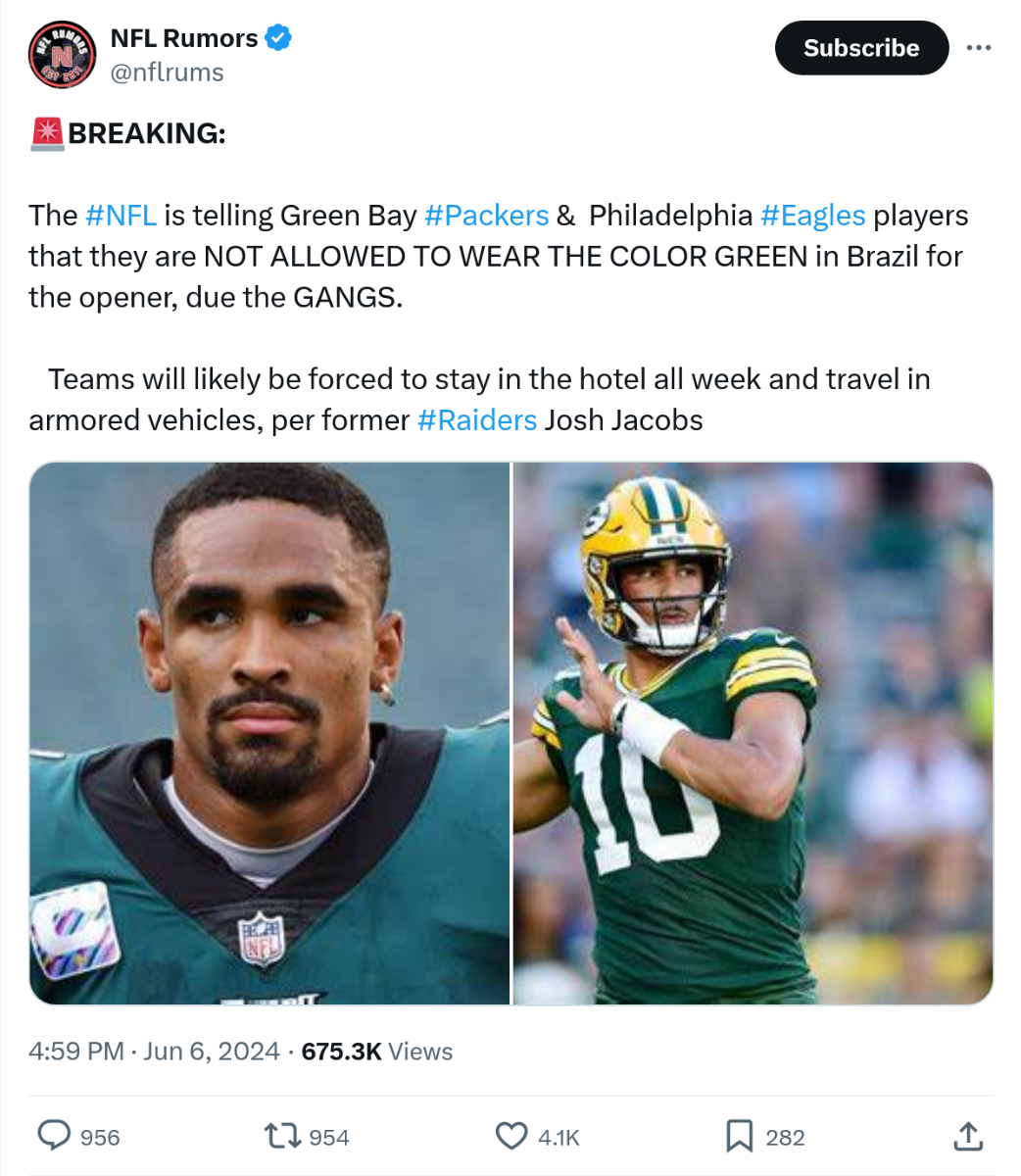 June 8, 20241 yr Sounds like the green color thing is soccer team related and not gang related according to the NFL. Ultimately the teams and fans can wear green. https://www.cbssports.com/nfl/news/nfl-responds-after-josh-jacobs-says-eagles-packers-will-be-banned-from-wearing-green-in-brazil-rb-apologizes/#:~:text=During a recent interview on,with the gangs and stuff."