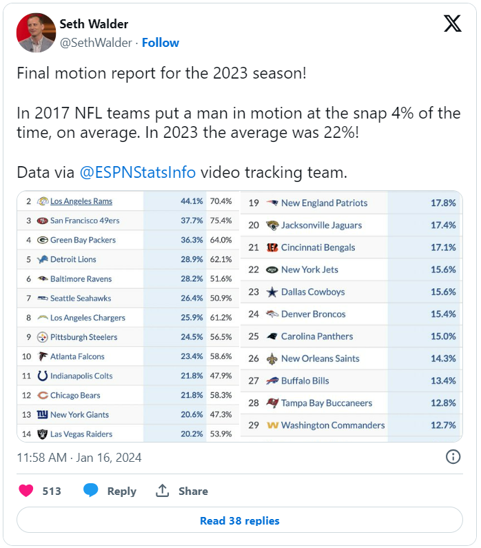 February 10, 20241 yr "While motion rates and Yards After Catch (YAC) don't have a direct correlation, they do work hand in hand." They are correlated or they are not. If you can't show a correlation between motion rates and YAC then it's not a true argument. So he's either too lazy to prove it or it's false.