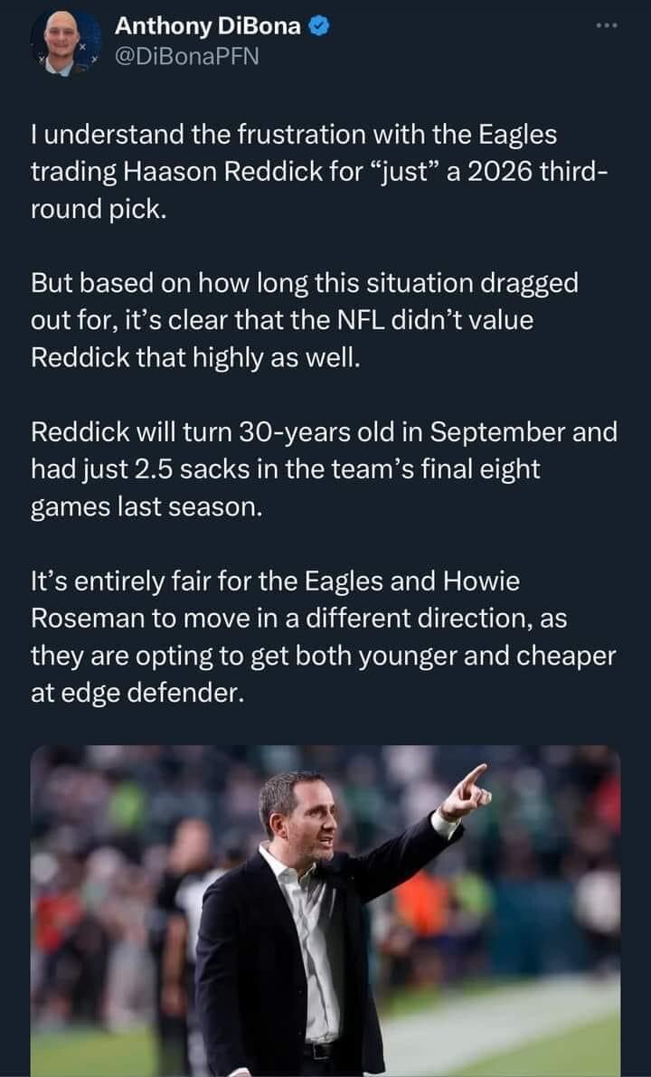April 1, 20241 yr 6 minutes ago, judunno said: The way I see it Reddick is a casualty from extending Bradberry and Slay. Not only did they take money that could have potentially went to Reddick they soured the taste for extending older guys. I think the real casualty is Reddick thinks he deserves close to Bosa (Top tier money) or Parson projection of future contract. Every GM clearly believes he isn't worth that. At least up to now. And draft compensation was quite reasonable for him. He was essentially a free agent this offseason and got traded for a likely mid 3rd rounder and was not extended. Tells you all you need to know.