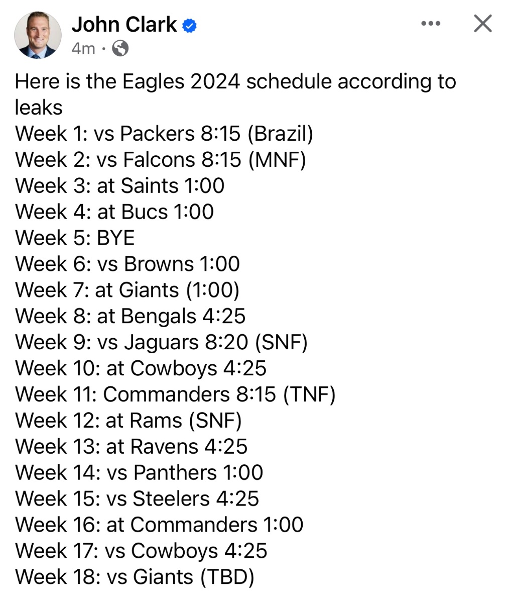May 15, 20241 yr 9 hours ago, RememberTheKoy said: W1 Packers - Brazil Friday Night Peacock Football. W2 Commanders 1 PM W3 Browns 4 PM W4 @Bengals MNF W5 Panthers 1 PM W6 @Bucs 4 PM W7 Jaguars TNF W8 @Ravens SNF W9 @Giants 1 PM W10 BYE W11 @Cowboys Thanksgiving W12 Steelers 1 PM W13 @Rams 4 PM W14 @Saints 1 PM W15 Falcons SNF W16 Giants 1 PM W17 Cowboys SNF W18 @CommanderS 4 PM That there is a 14 win season