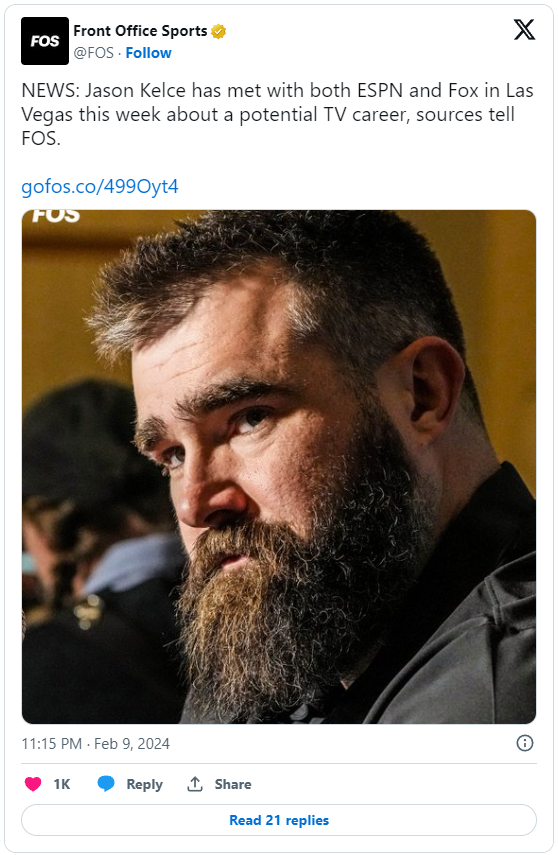 Posted February 12, 20241 yr Report: Jason Kelce meets with Fox, ESPN about possible TV career The longtime Eagles center has reportedly met with Fox and ESPN while in Las Vegas for the Super Bowl this week with his future still undecided. BY NICK TRICOME PhillyVoice Staff NATHAN RAY SEEBECK/USA TODAY SPORTS Eagles center Jason Kelce at the Pro Bowl last week. He still hasn't made an official decision on his future. Jason Kelce hasn't made any official announcement on his future yet, but he does appear to be seeing what's out there after football. Per Michael McCarthy of Front Office Sports, Kelce met with ESPN and Fox this week while in Las Vegas for the Super Bowl, possibly gauging interest in a TV career with either of the two networks. It's a "testing of the water," one of McCarthy's sources said of the meetings, with NBC, CBS, and Amazon expected to check in as well should broadcasting be the route that Kelce wants to take. The longtime Eagles center is already well-suited for the camera, as his "New Heights" podcast with his brother Travis has taken off in popularity over the past year and with both of their celebrities skyrocketing. Plus, the 36-year old would bring a six-time All-Pro and Super Bowl-winning resume to the table for any potential network he would theoretically join. But that's only if he does, in fact, retire. After the Eagles' month-long spiral ended in a blowout of a wild card loss to the Buccaneers down in Tampa Bay, reports indicated that Kelce told his teammates this was it. Publicly, however, Kelce has maintained that he wants to take his time to fully think it through before making any official call. In the meantime, he went to the Pro Bowl last weekend and has been along for the ride watching Travis make another run to the Super Bowl with the Chiefs, who will be facing the 49ers on Sunday. https://www.phillyvoice.com/eagles-news-jason-kelce-fox-espn-meetings-broadcasting-future-super-bowl-nfl/