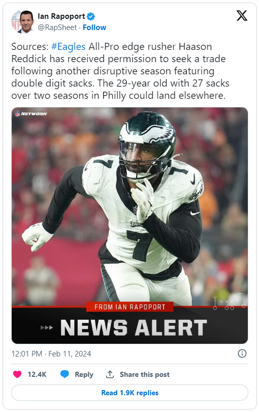 February 12, 20241 yr My initial reaction was that this was a really bad decision to let Reddick seek a trade. And if he does go that creates another hole on an already bad defense. But actually it could make sense. If they can get good compensation for him then great. If they can’t then they keep him and they look to work out a deal.