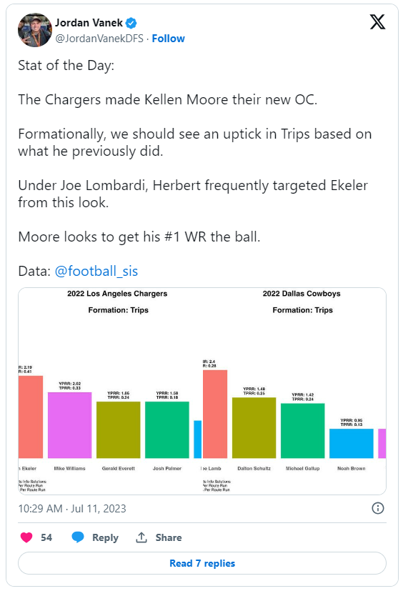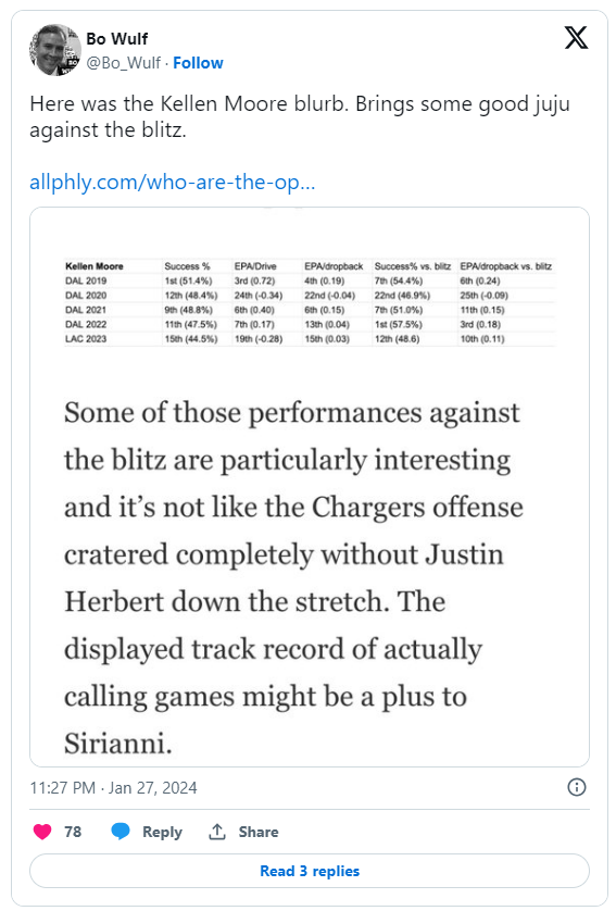 Posted February 15, 20241 yr Kellen Moore can help the Eagles improve against the blitz Part 2 of BGN’s deep dive on Philadelphia’s new offensive coordinator. By Jonny Page Feb 12, 2024, 1:05pm EST As I said in the last Kellen Moore post, I have watched so much film on the new Eagles offensive coordinator that I will turn all the clips I recorded into a series of posts, rather than just one long article. Each one will focus on multiple different aspects of Kellen Moore’s philosophy. If you haven’t checked out last week’s post then please read that before this one! Part 1: Run Game, PA Naked Bootleg and Motion Last time I spoke a lot about tendencies, we looked at various numbers. We will talk film this week and look at three areas that stood out to me when watching Kellen Moore’s pass game. There is only one place to start... Handling the Blitz The Eagles’ season collapsed because they couldn’t handle the blitz. It is quite incredible just how bad they were against pressure last year. If you were to take away the blitz, the Eagles’ offense was perfectly fine. It ruined the Eagles’ season and certainly frustrated the hell out of all the players. You can argue that the Eagles' biggest priority was picking a new offensive coordinator who could plan for the blitz. Well, I have good news. Kellen Moore’s film against the blitz is very promising in the games that I watched. And the stats back me up. So, what does Kellen Moore do against the blitz? I am sorry to disappoint but, he doesn’t do anything radical. I think his teams are very well coached and they do the basics right over and over again. If you are expecting to read about a brand new revolutionary offensive approach against the blitz that will blow your minds, then I sadly can’t give you what you want. But I can show you what a good coaching staff can do to prepare a team to face pressure. In very simple terms, Kellen Moore’s teams are well-coached to have a number of hot routes or built-in answers to pressure. If you are a proper scheme nerd like me, please have a look over some of the plays in the Cowboys' 2021 playbook which proves that Moore is focused on handling pressure. I won’t bore you with the specifics, but nearly every play looks like the one above. You will frequently see the words ‘Hot Built-In’ or ‘Bandit Build-In’ (Bandit is a sight adjustment telling the receiver to adjust their route and get open quickly if an extra blitzer comes from that side). If you want to get better against the blitz, you have to spend a lot of time preparing for it throughout the off-season. You need to have answers on every single play to a lot of pressure. It takes time. It takes preparation. It takes attention to detail. You can see the answers on film. Firstly, this type of play is what you see a lot on film. You can see that the quarterback and his receivers are on the same page. Moore’s offenses didn’t try and take deep shots against pressure like the Eagles attempted to do. They just kept the chains moving by throwing into the area that was vacated by the blitzer. Football can be simple sometimes, can’t it? The other thing you can do is design plays that give you an insight into what the defense might be doing by using shifts and motion. The Chargers here use shifts pre-snap to identify the zone pressure look and Herbert throws into the side bringing the overload. Also, Moore’s offenses were not afraid to leave backs and tight ends into block if needed. The Eagles have struggled with their running backs in pass protection the past couple of seasons and this is an area that they need to address. You can see a theme, can’t you? Simple throws, where the quarterback and receivers are on the same page. It looks easy, but this stuff takes a lot of preparation. Everyone can get a little too obsessed with hot routes, and the reality is that sometimes building an offense with a variety of routes at different depths can provide a lot of answers against pressure. The key is giving the quarterback just enough time, which means no free rushers! Even when the Eagles designed plays against pressure last year, they just couldn’t hold up in pass protection as they were outnumbered. Quads/Trips Formations One of the biggest things I noticed from Kellen Moore’s offenses was the use of quads and trips. Get ready to see a lot of formations next year that isolate one side of the field. AJ Brown is going to love this offense. He’s going to be isolated a lot and moved around the formation a lot. CeeDee Lamb is a superstar, and I think Kellen Moore is going to try to isolate AJ Brown like he did with Lamb. I love seeing the use of quads formations and ‘fast 4’ but the reality is that this stuff only works if you have a receiver that can win these one-on-one matchups. AJ Brown can win one-on-one matchups. This stuff happened a lot in the film I watched. A lot. If Jalen Hurts really ‘can’t throw it to the middle of the field’ like some people believe then we will find out this year. It turns out that Kellen Moore’s been doing this for a few years too... If you want to get really excited, Kellen Moore has also lined up offensive linemen in trips to run screen plays. Jordan Mailata blocking out in space? Sign. Me. Up. Vertical Shots Listen, you didn’t really think the Eagles were going to hire an offensive mind who didn’t want to push the ball down the field, did you? I know some of you are fed up with an approach that focuses on explosive plays, but we all know that explosive plays are vital for an offense to succeed. The issue with the Eagles last year was that many plays felt like it was explosive play or bust because they would be vertical shots to a covered receiver, and we would simply hope that the star receiver would come down with the football. Moore’s offense is not like that. Moore uses several different formations to try and create explosive plays. His Cowboys’ offenses were not af