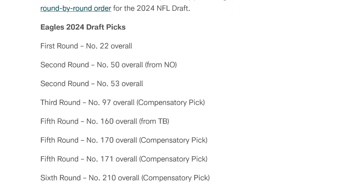 March 10, 20241 yr Author 3 hours ago, EagleVA said: Over and over again you guys are speaking of selecting a guy in a round that the Eagles don't have, they don't have a 6th at this time, currently they're done selecting players after those 5ths. So I guess compensatory picks don't count https://www.philadelphiaeagles.com/news/philadelphia-eagles-2024-nfl-draft-picks