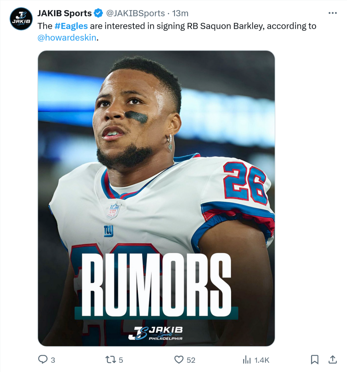 March 8, 20241 yr I think the Eagles will be in on McKinney but will see if they get priced out, kinda like they did with Marcus Williams 2 years ago. Justin Simmons and CJGJ will be strong targets as well. One of those 3 guys will be in Philly soon...and I'm calling that a lock. The may also double-dip at the S position...if so, I can see the 2nd guy being someone like Chinn. I can take or leave Barkley....would depend on the contract, but as for the player, I still think he can produce well enough for at least another year or 2. I'd be good with bringing in Jon Runyan Jr. I imagine G will be lower on the FA priority list if they feel Steen will be ready. If they do sign a G like Runyan, that likely means they don't have faith in Steen at RG. Ultimately, I hope we come out of FA with a S, LB and slot WR...all 3 of decent quality that will be notable additions.