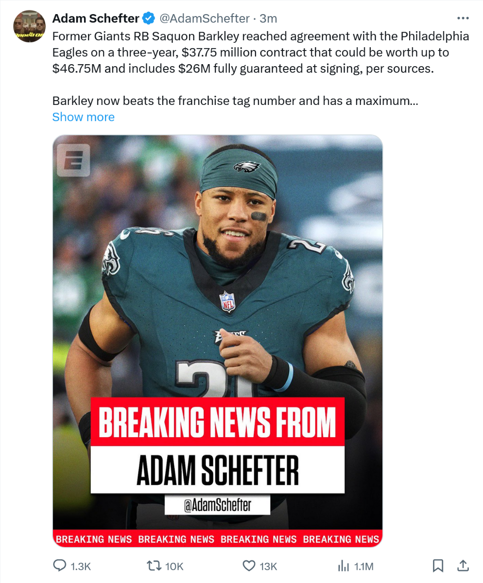 March 11, 20241 yr Author So in a matter of 12-13 months, the Eagles let former Penn St. RB Miles Sanders walk, and pick up his star teammate, no. 2 overall pick, Saquon Barkley. I know a few Giant fans who are ready to puke with that one.
