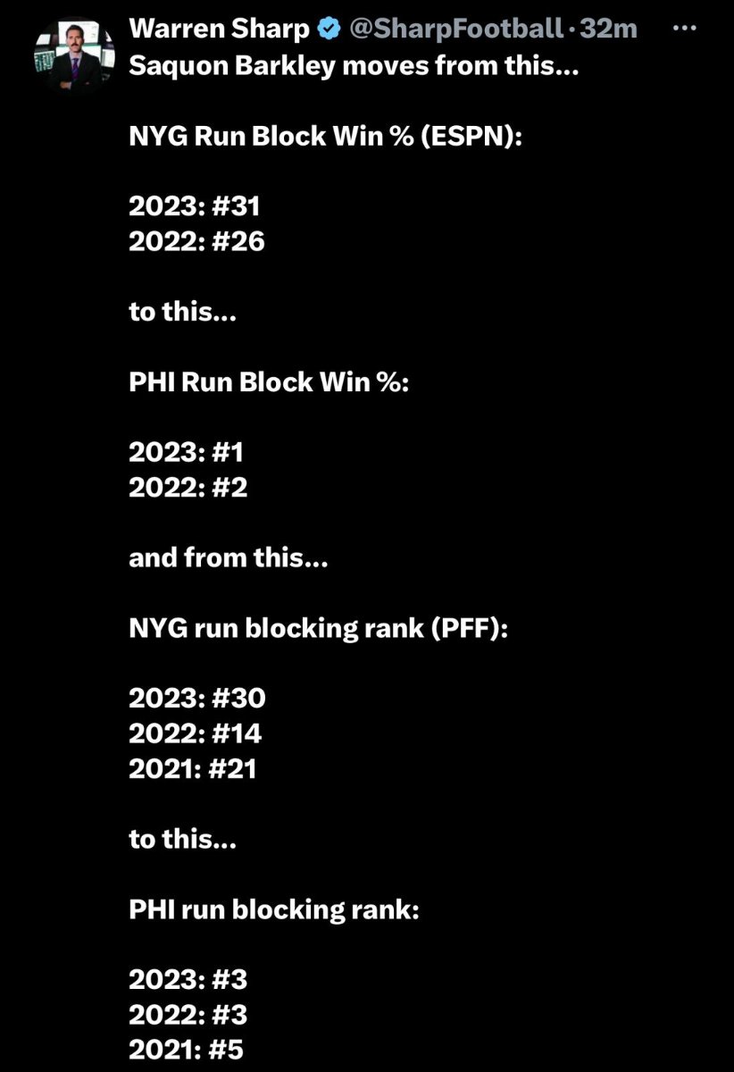 March 11, 20241 yr 1 hour ago, Portyansky said: There are very few RBs in the league who can takeover a game. He is one of them. Pre-injury, yes. I'm not nearly as high on Barkley any more. We could have gone after Josh Jacobs for similar or less money. Or kept Swift for less. And I think the production would be relatively the same from all 3 of them.