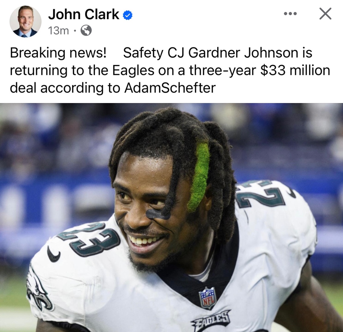 Posted March 12, 20241 yr 3 year deal! Great move! https://www.cbssports.com/fantasy/football/news/eagles-c-j-gardner-johnson-heading-back-to-philly/