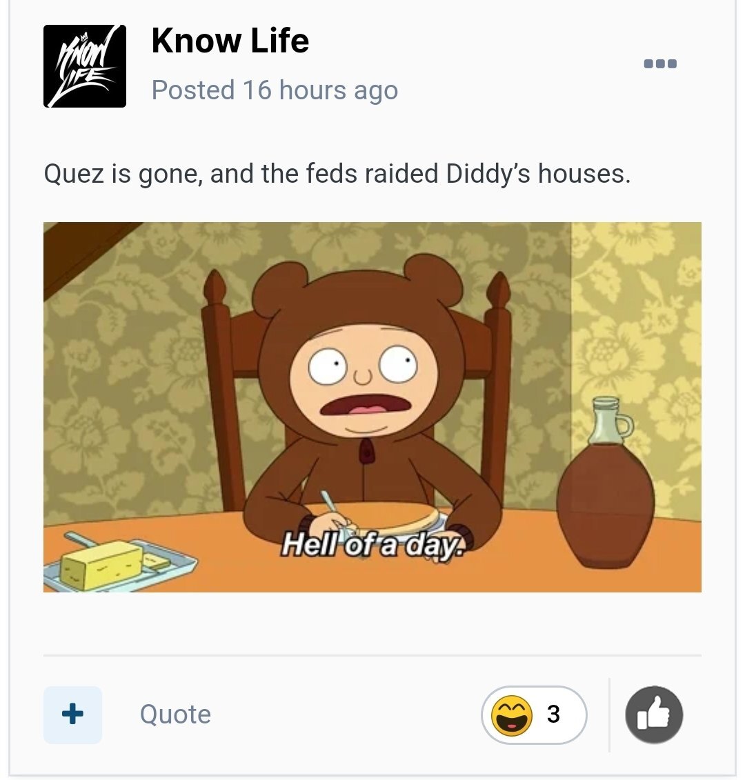 March 26, 20241 yr 17 minutes ago, NOTW said: It's all over the news and social media. https://www.npr.org/2024/03/25/1240813034/homes-linked-to-sean-diddy-combs-raided-by-law-enforcement https://www.nbcnews.com/news/us-news/sean-diddy-combs-federal-investigation-homes-searched-rcna145006 https://abc7.com/sean-diddy-combs-puff-daddy-homeland-security-raid-bad-boy-films/14569686/ It takes a while for the pony express to drop off the news where @HazletonEagle lives