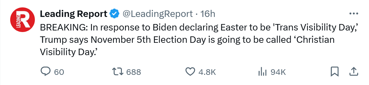 April 3, 20241 yr MAGA is still butthurt over Transgender Day of Visibility? I am glad Christofascists do not get a monopoly on the calendar. International Trans Day is always on March 31. It's not on Easter morons.
