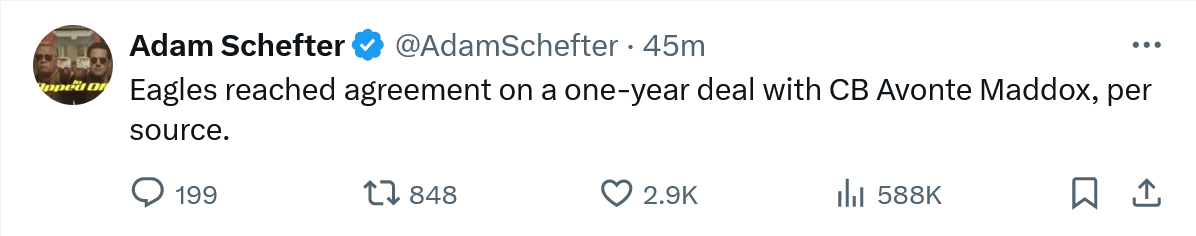 April 5, 20241 yr Howie makes moves like this in April every year. This isn’t about making fans happy.  This isn’t about Avonte Maddox.  It’s not even precisely about nickel cb. This is about the draft.   We don’t HAVE to draft a cb immediately now.  And if we do, that CB doesn’t HAVE to have slot flexibility.  It doesn’t mean we won’t.  We probably will.  But you can’t go into the draft with the restrictions of one fixed check box that is also broadcast to the rest of the league….that imminently needs to fill a hole for your 2024 team. Maddox is unreliable and has no future, but he can be a good nickel cb.  And that impacts how freely Howie can draft.