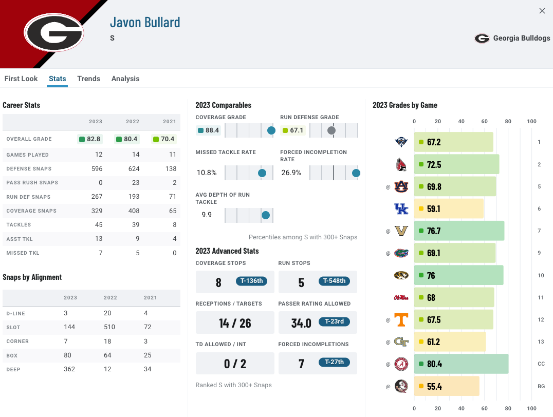 April 21, 20241 yr Bullard is one of the guys, if you are making a list of "football guys" you have to put him on. And so, hes very high on my list of wants. I posted a podcast of Daniel Jeremiah on with the NFL Stock Exchange guys and he told a story about Bullard that was just so damn impressive. Hes one of those guys who you sorta just know will be successful even if he had no other athletic traits because of how hard he works and how much he studies. The nice thing about Bullard is that he has some athletic traits too. I like him as a physical nickel/S hybrid type.