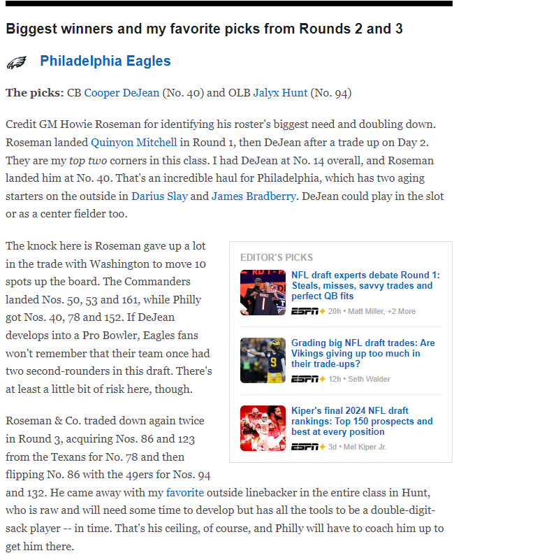 April 27, 20241 yr Here's how I'd grade the first 3 picks taking into consideration draft position and trades: Rnd 1, Pick 22: Quinyon Mitchell CB Toledo - A+ - Arguably the best CB in the draft class this late in the 1st round without moving at all. Can certainly make a case for Terrion Arnold over Mitchell, but hard to argue against this pick. Perfect intersection of value and need. Rnd 2, Pick 40: Cooper DeJean CB Iowa - B+ - Great value getting a solid 1st round prospect a pick 40 but the cost of the trade to move up and giving up an additional 4th round pick premium (per Jimmy Johnson trade value chart) is a little steep, but not prohibitive. That brings the trade down from an A in my books. Rnd 3, Pick 94: Jalyx Hunt LB Houston Christian - C - Project pick that is very raw but has great athleticism and upside, definitely feels like a Davion Taylor, DTN, Bryan Smith pick here. The mitigating factor here is the multiple trades down to recoup draft pick value and reduce the extent of the reach here, that keeps this pick from being a D or F in my book and is an average C grade.