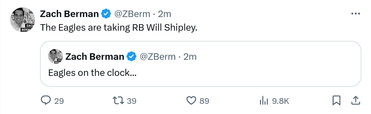 April 27, 20241 yr Interesting that they traded their pick to the Dolphins who took a back and then they took Shipley. Irving went off the board a couple picks later and the two picks after the Eagles pick were RB/RB by the Bills and 49'ers