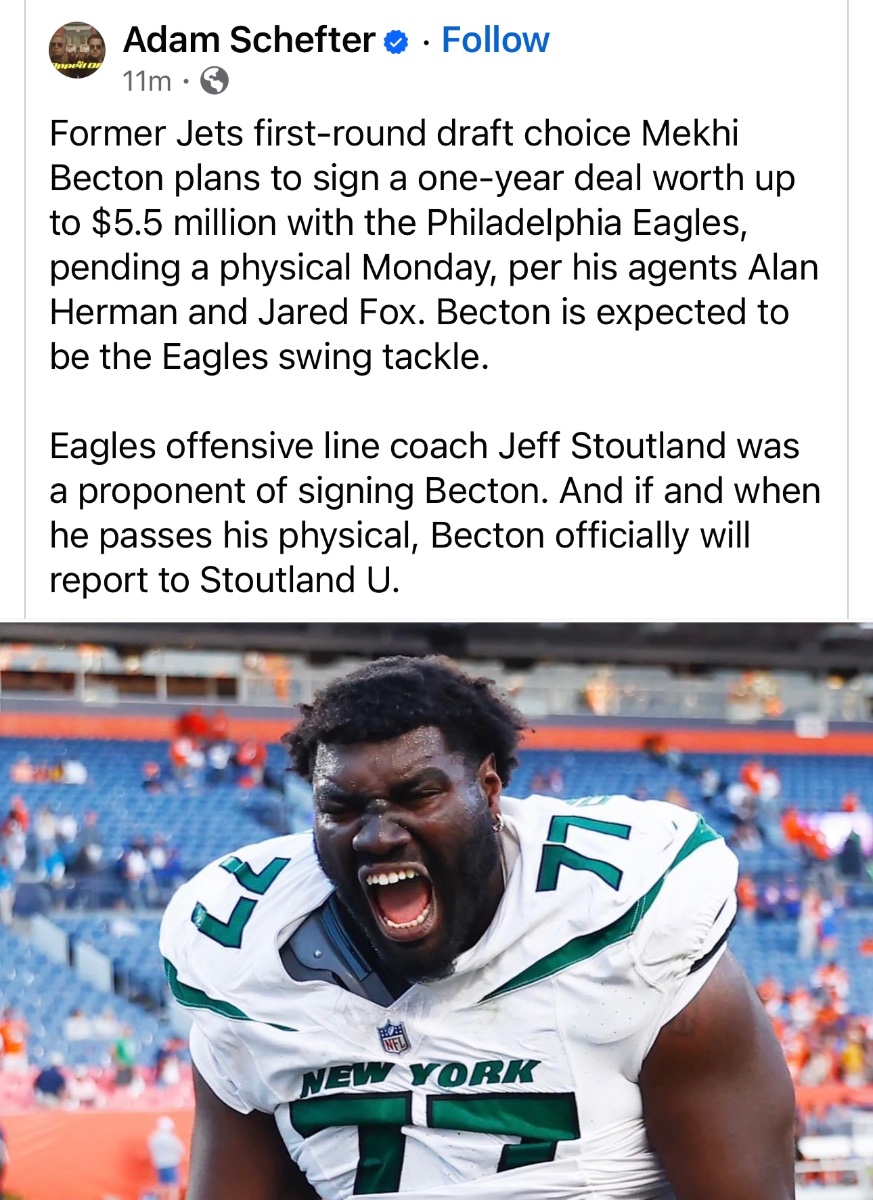 April 28, 20241 yr Schefter reports Former Jets first-round draft choice Mekhi Becton plans to sign a one-year deal worth up to $5.5 million with the Philadelphia Eagles, pending a physical Monday, per his agents Alan Herman and Jared Fox. Becton is expected to be the Eagles swing tackle. Eagles offensive line coach Jeff Stoutland was a proponent of signing Becton. And if and when he passes his physical, Becton officially will report to Stoutland U.