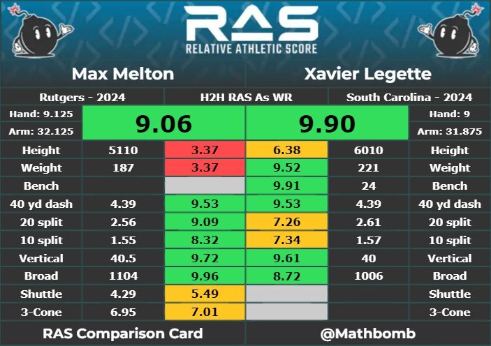 May 2, 20241 yr 12 minutes ago, garingovt2000 said: Are you sure they formulate it? I just entered in 2 sets of people who had same 40 times and they each had different 10 and 20 yard splits Im sure. Because I noticed it was always the same for everyone that had the same 40 time. So I read about it and they have a formula. Once in a while you see a 10 yard split reported so maybe there will be a few who they use actually reported data for. But a lot of their data is just made up when it comes to that stuff. I cant find the forumla right now but you can see this one the website saying they use the real data "when available" 20 yard split: Measured in seconds, official combine times are used when available and not best of the two runs. *10 yard split: Measured in seconds, official combine times are used when available and not best of the two runs. *The 10 yard split is also included for many when discussing a player’s explosion and not simply a measurement of speed.