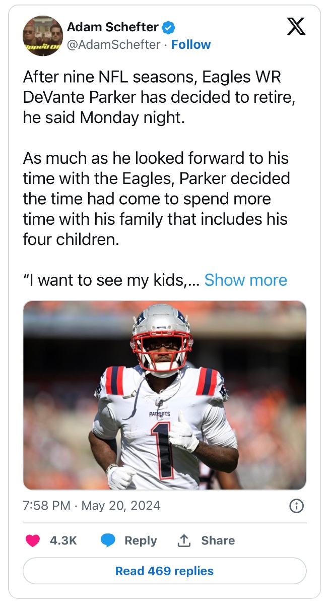 Posted May 21, 20241 yr Just reported that WR DeVante Parker had announced he is retiring. https://thelibertyline.com/2024/05/20/eagles-devante-parker-retires/