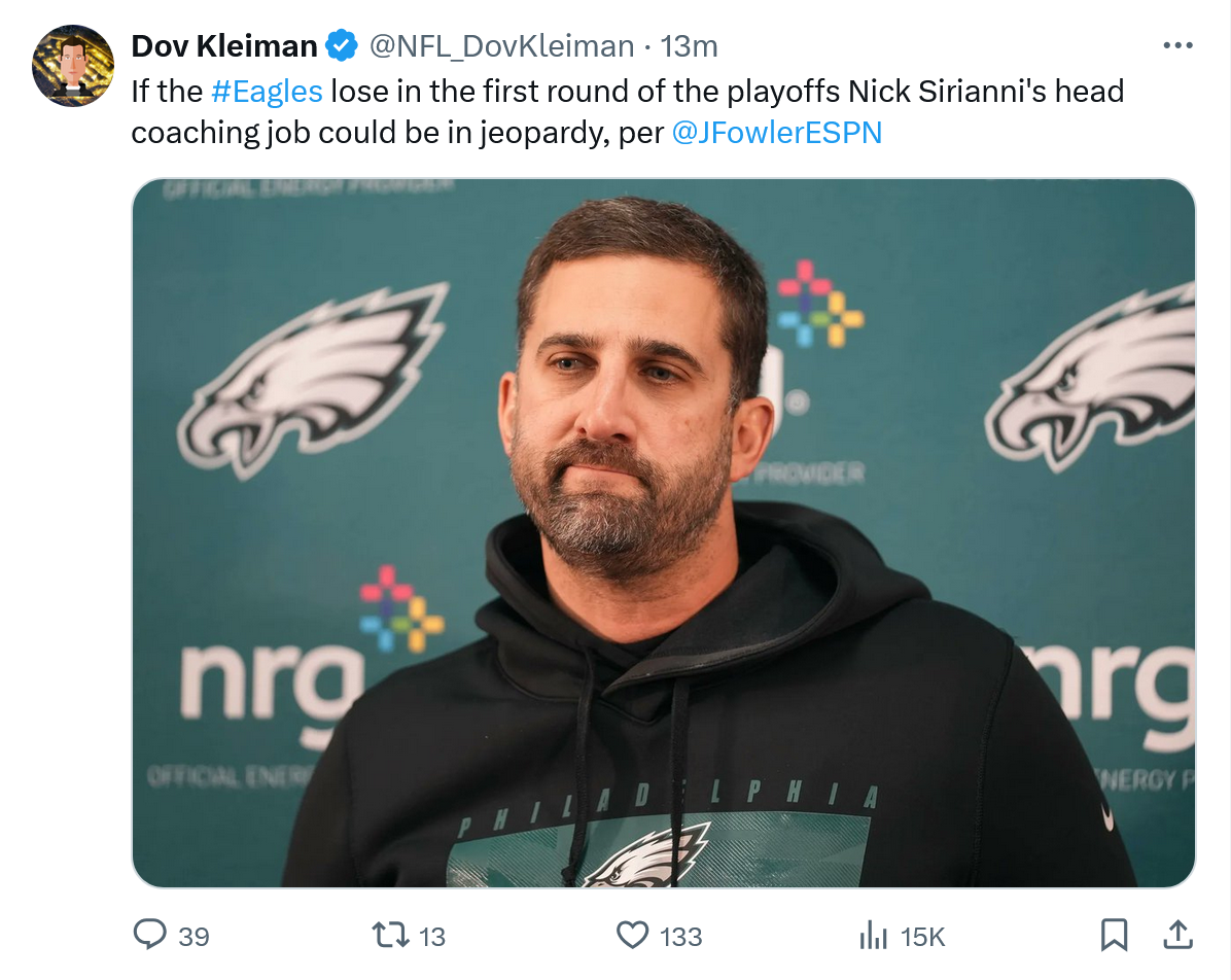 December 29, 2024Dec 29 I mean, all of this stuff notwithstanding - and I'm not dismissing it as irrelevant - I'll eat my hat if he is fired. All we are seeing now is reinforcing current positions. For some, he can do little wrong. Some will support him regardless, and I am probably one of them. Some will never support him no matter what he does, short of win a Super Bowl, like it's the only kind of success there is. Time will tell which faction is correct. Of the options outlined above, I want no part of BB. I want no part of Carroll. McCarthy, are you kidding? Vrabel? I can't see it. Like I've said before, there's also a franchise credibility issue here. Let's say they pull the trigger on Sirianni after he took the team to the playoffs in his first four seasons (or, some would say, the team dragged him there). You're setting a standard that is damn near unattainable for the next man up. Philadelphia stops being a destination and becomes a poisoned chalice. Not a fair comparison, really, but for soccer fans you just have to look at a club like Manchester United as an example of what can happen then. You don't want to end up in that situation.