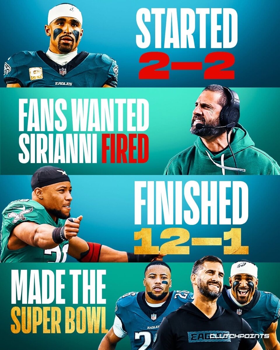 February 10Feb 10 Yeah. Yeah. Yeah. SuperBowl win. But, Kellen Moore and Vic Fangio carried Sirianni. Fire Siriranni now!!