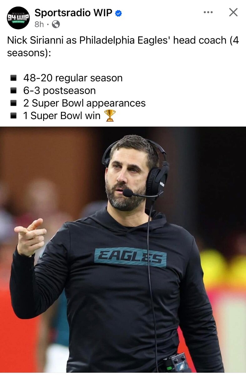 February 10Feb 10 48 minutes ago, CouchKing said: I just wanted to be the first to get that in there. Okay, Sirianni won a Super Bowl. Big deal. We fired Doug Pederson. We'll fire Sirianni too. Let's see him win another one. I was against them firing Doug, but seriously his last season as HC was a disaster. Sirianni has been to the bowl twice and won it with multiple different coordinators. I was a big Sirianni hater, but I was wrong. This guy knows how to motivate men and win football games.
