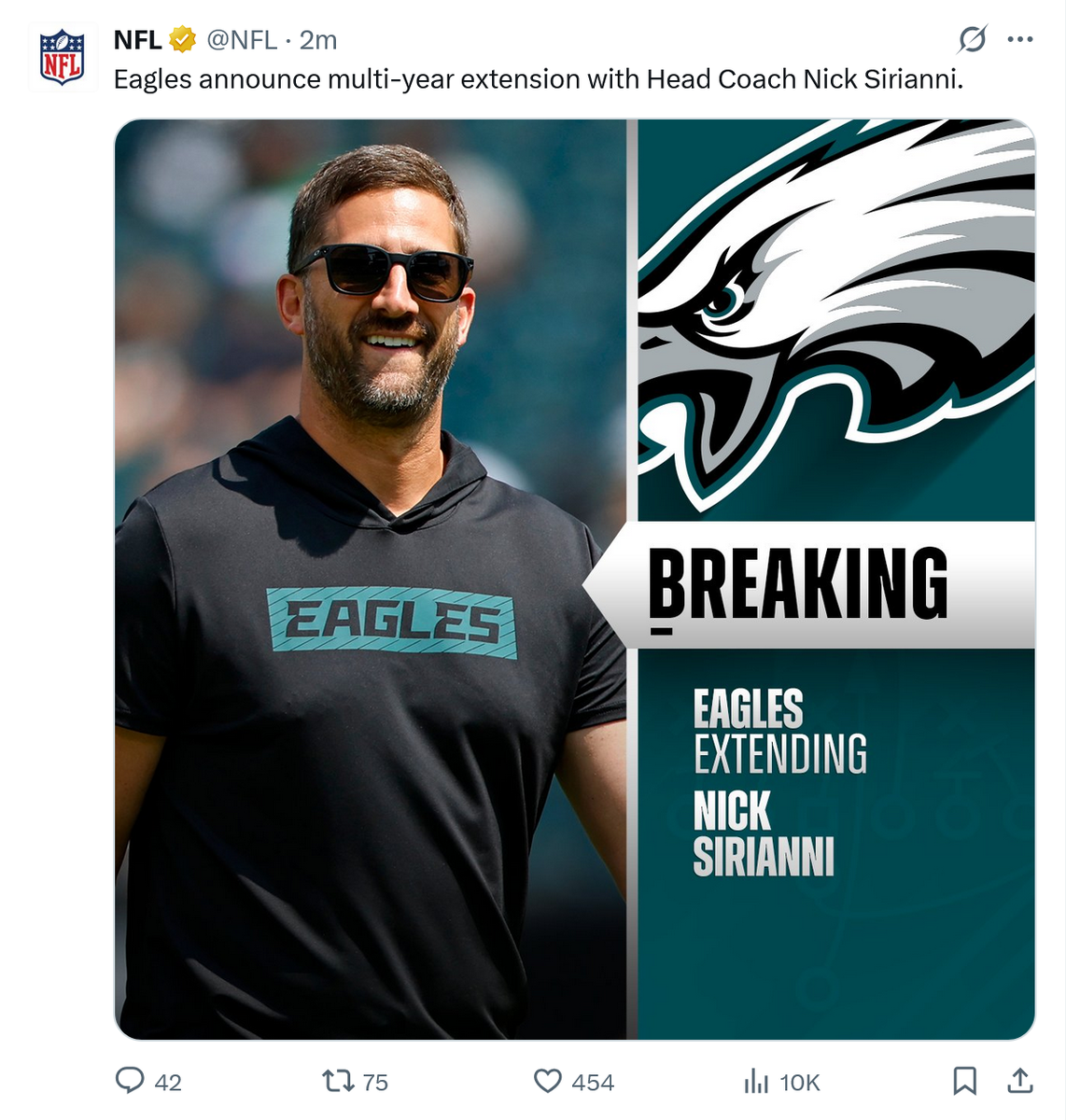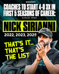 Monday at 05:42 PM3 days Nick Sirianni is On The Verge of NFL HistoryAfter Sunday’s win, Nick Sirianni is now in striking distance of the most wins an NFL coach has ever had through their first 5 seasons, including playoffs:1. George Seifert - 682. Paul Brown - 643. Sean Mcvay - 63….Nick Sirianni - 58 through Sunday—————————————-This means that if Nick Sirianni wins 6 more regular season or playoff games, he will have the second most wins by a HC in his first 5 seasons, and the most by a HC in the salary cap era.And if somehow the Eagles manage to win 14+ regular season + playoff games (which they won 18 last year), he will tie or beat George Seifert for the most wins an NFL head coach has ever had in his first half decade in the league’s entire history.***important factor of note:** George Seifert took over the #1 team in the league his first season: the Super Bowl champion 49ers, who were coming off 6 consecutive 10+ win seasons. Nick Sirianni took over the 4 win Philadelphia Eagles, who earned the 6th overall pick in the draft and hadn’t won 10+ games in 3 years.Philadelphia’s Remaining Schedule:Week 5 Sun, 10/5 vs DEN 1:00 PM CBSWeek 6 Thu, 10/9 @ NYG 8:15 PM Prime VideoWeek 7 Sun, 10/19 @ MIN 1:00 PM FOXWeek 8 Sun, 10/26 vs NYG 1:00 PM FOXWeek 9 BYE WEEKWeek 10 Mon, 11/10 @ GB 8:15 PM ESPNWeek 11 Sun, 11/16 vs DET 8:20 PM NBCWeek 12 Sun, 11/23 @ DAL 4:25 PM FOXWeek 13 Fri, 11/28 vs CHI 3:00 PM Prime VideoWeek 14 Mon, 12/8 @ LAC 8:15 PMWeek 15 Sun, 12/14 vs LV 1:00 PM FOXWeek 16 Sat, 12/20 @ WSH TBD FOXWeek 17 Sun, 12/28 @ BUF 4:25 PM FOXWeek 18 TBD - Flex Game vs WSHPhiladelphia is favored in all remaining games source