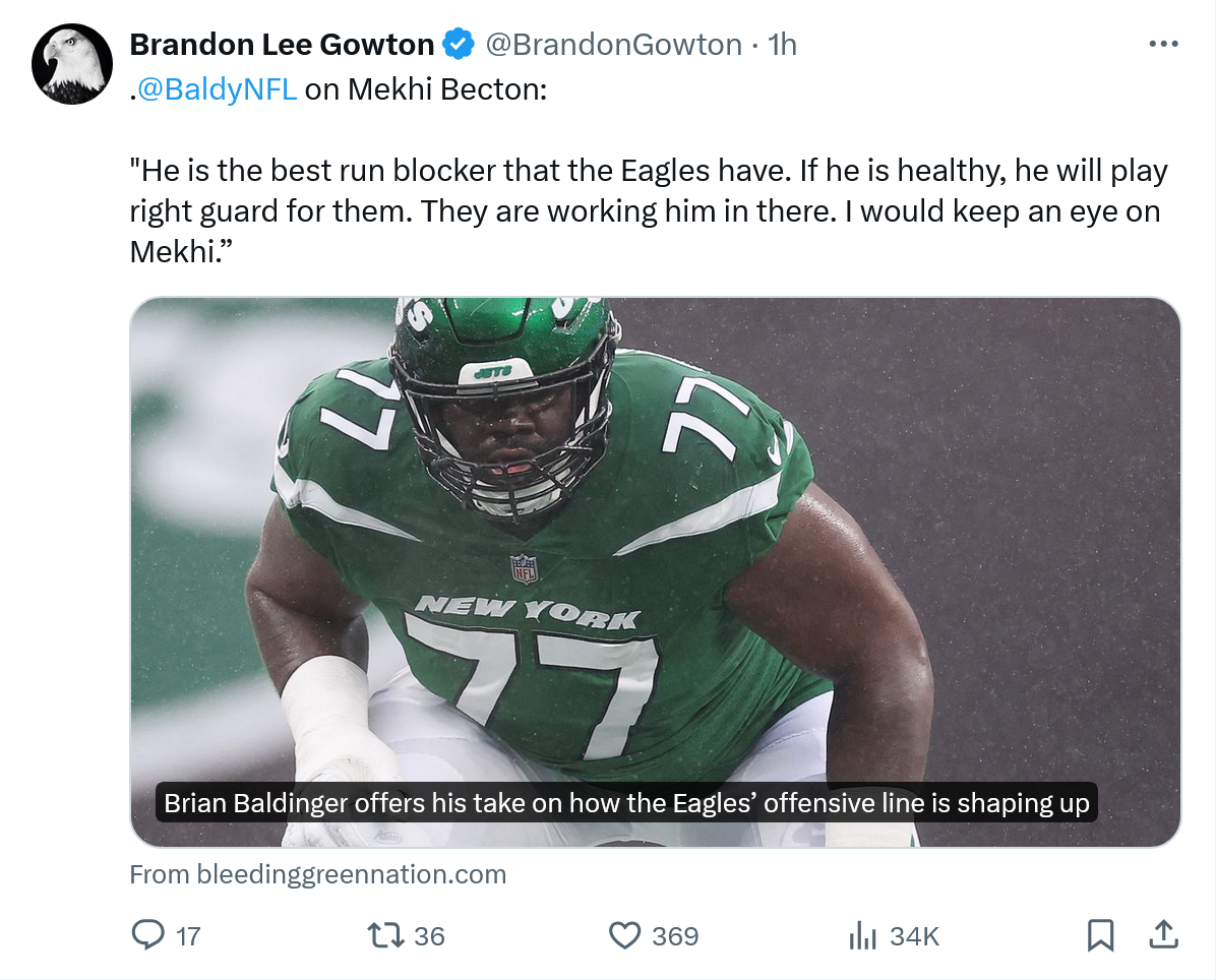 July 21, 20241 yr Author Seeing a lot more chatter these days that Becton could very well be the starter at RG. If he's a player the Eagles want to retain long term, I could see them making him a starter this year. Look what the team did with Cam Jurgens last year. Even if they don't envision him playing at RG long term, he may be viewed as being so good that they have to put him somewhere - and there's an opening at RG at the moment.