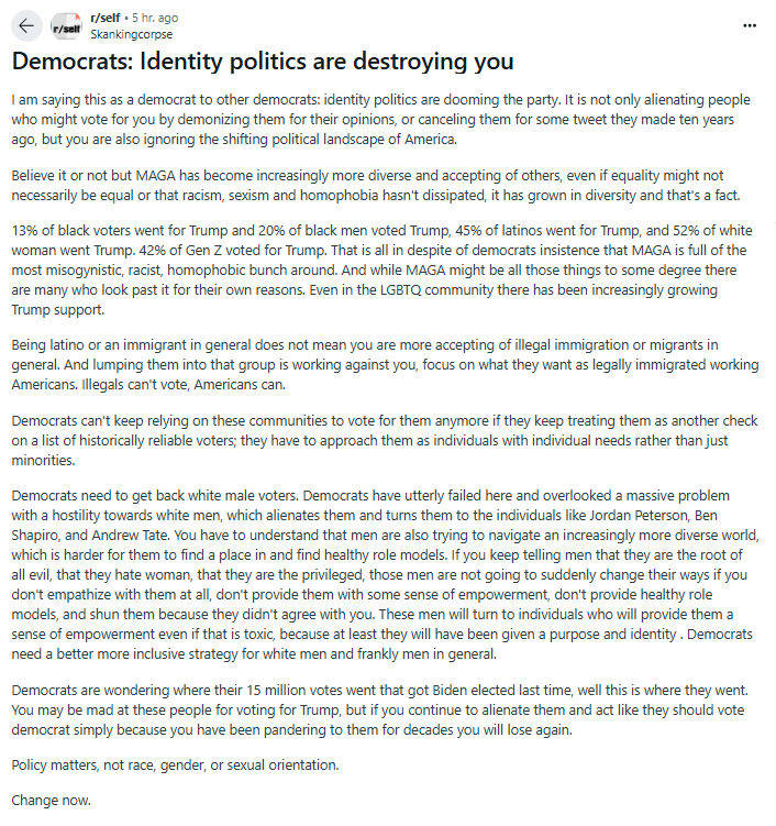 November 8, 2024Nov 8 3 hours ago, Gannan said: No one said this when Dems won big in 2018 and 2020. While I agree their platform is stupid to incorporate all that stuff, I don't think it's why they lost. If houses, gas, and groceries were cheaper they would have won. People probably wouldn't have even cared that Biden is like 100 years old. Sure they did. All well before. Obama was all identity politics and trump is the recoil from it