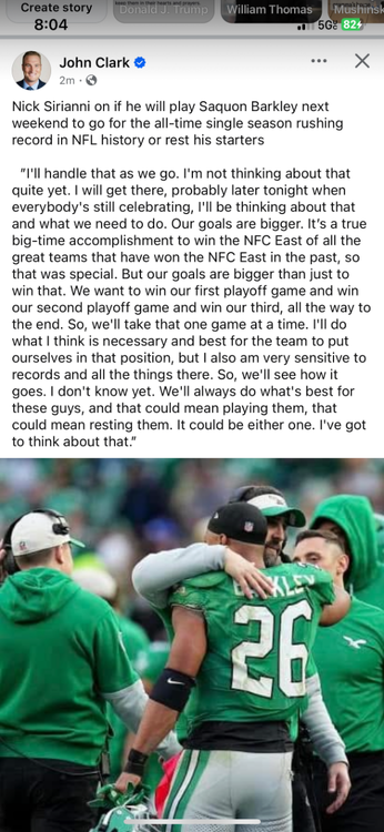 December 28, 2024Dec 28 5 hours ago, brkmsn said: I'm pretty confident Barkley will get week 17 off if it doesn't effect the playoff seeding. That wouldn't shock me either, unless it's well within reach, then I think they'll talk about it and maybe even let Barkley make the call.