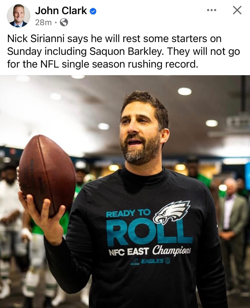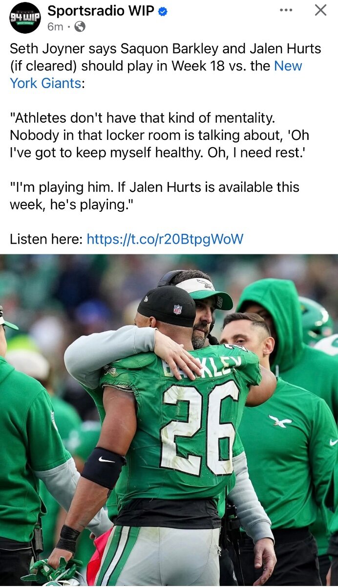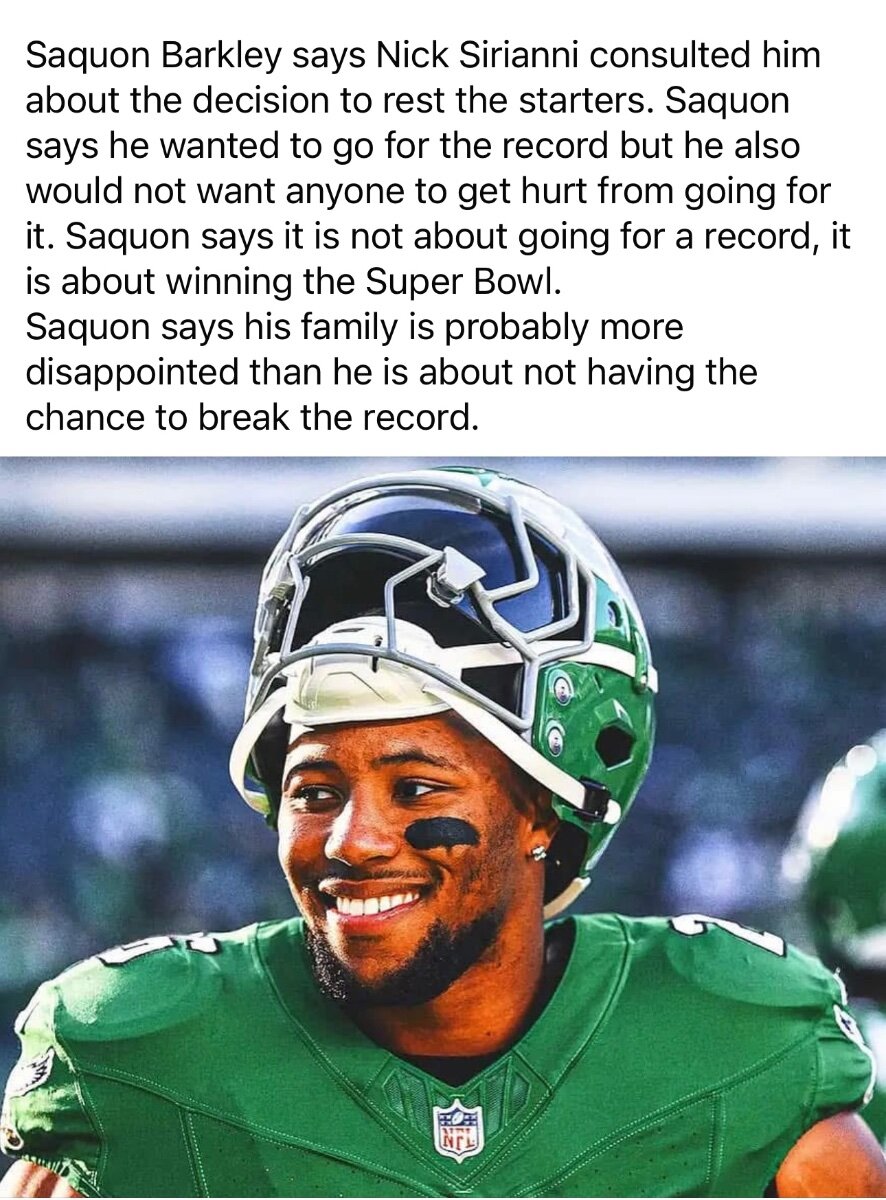 December 31, 2024Dec 31 1 hour ago, time2rock said: Nick Sirianni will talk to everyone before deciding whether to play Saquon Barkley By Mike Florio Published December 31, 2024 11:27 AM Will the Eagles let running back Saquon Barkley attempt to get the 101 rushing yards necessary to break the single-season rushing record? It’s still TBD. And the decision will be made after head coach Nick Sirianni talks to pretty much everyone in the building. "I’ll talk to our staff, I’ll talk to the players, I’ll talk to [General Manager] Howie [Roseman], I’ll talk to Mr. Lurie. I’ll talk to everybody to try and make sure I’m making the best decision for the football team,” Sirianni said Tuesday on WIP radio in Philadelphia, via ESPN.com. The question is simple to articulate, hard to answer: "What’s the best thing for the team and then also what’s the best things for the individuals going for the record?” The best thing for the team is to rest Barkley against the Giants. The best thing for Barkley is to chase history. If Barkley gets 101 or more yards and emerges unscathed, great. If he gets injured, not great. Sirianni can talk to whoever he wants. In the end, it’s his decision. Unless he lets Big Dom make it. https://www.nbcsports.com/nfl/profootballtalk/rumor-mill/news/nick-sirianni-will-talk-to-everyone-before-deciding-whether-to-play-saquon-barkley I think that unless Lurie (and Barkley) say 'go for it', he'll sit the starters.
