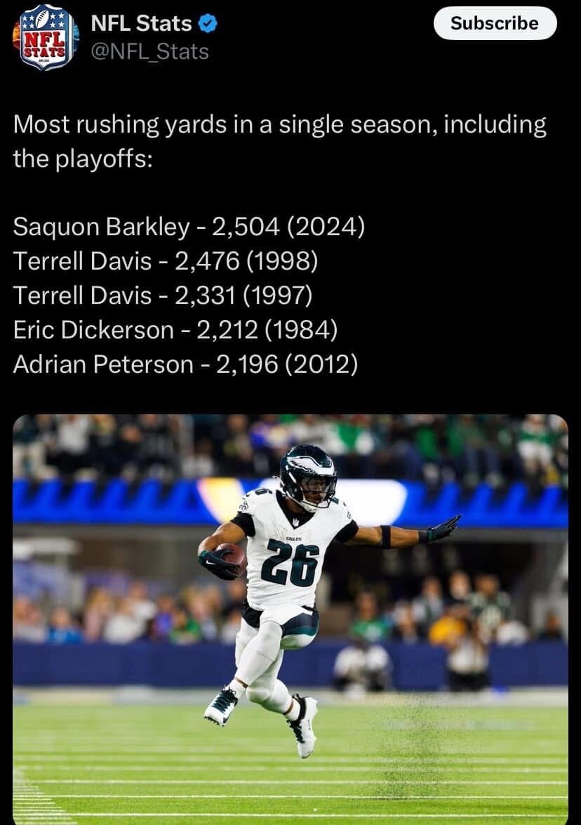 February 15Feb 15 Author Obviously not just a Barkley stat … Hurts contributed quite a bit too. But still, this is awesome!