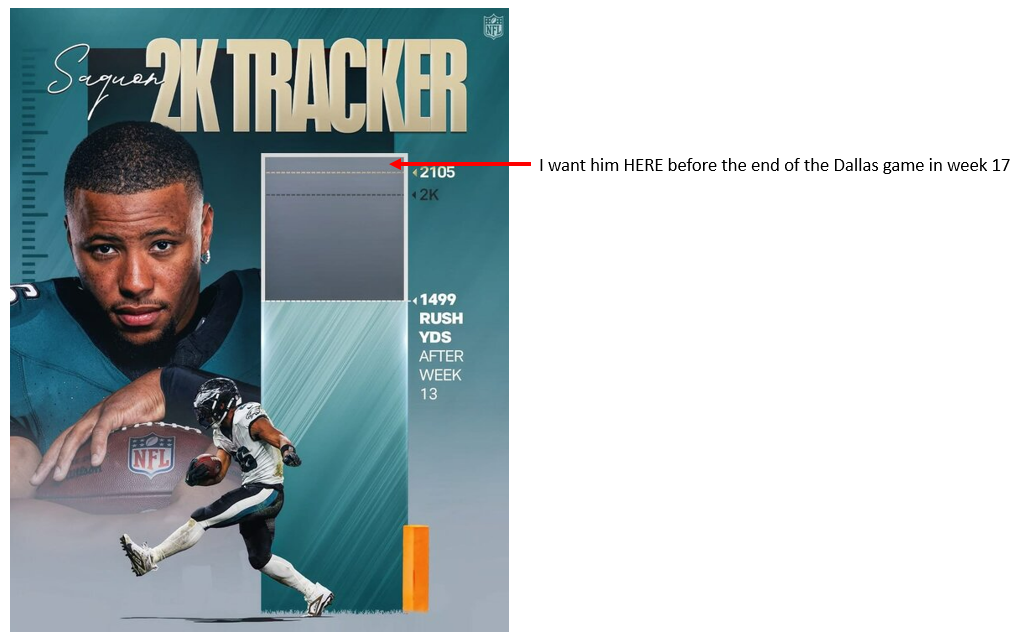 December 4, 2024Dec 4 Author Saquon needs 607 yards to beat Dickerson's record. In his favor, he will be facing 4 of the 6 worst rush defenses to close out the season: Panthers - 32nd Steelers - 4th Commanders - 27th Cowboys - 31st Giants - 29th Knock on wood but he very well may have the record before that final game. Imagine that ... he has the record and they can sit him week 18 and rest him for the playoffs. It would also be huge to do so in 16 games to avoid having to deal with the "need to put an * by it since it was 17 games" people.