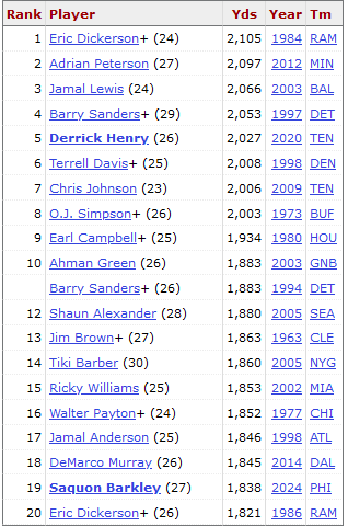 December 23, 2024Dec 23 I've heard some 'talking heads' suggest that Barkley breaking the record in 17 games might deserve an asterisk since Dickerson did it in 16 games. Of course, Dickerson's doesn't have an asterisk for doing it in 16 when OJ's 2003 yards happened in only 14 games. Just out of curiosity, I looked at Dickerson at 14 games. He was at 1792 yards in 14 games of 1984. Barkley this year in 14 games was at 1688. Simpson's yard per game average was 143.1, Dickerson's average was 131.6 through 16, and Barkley's average through 15 is 122.5. Here's the current top 20 single season rushing leaders: